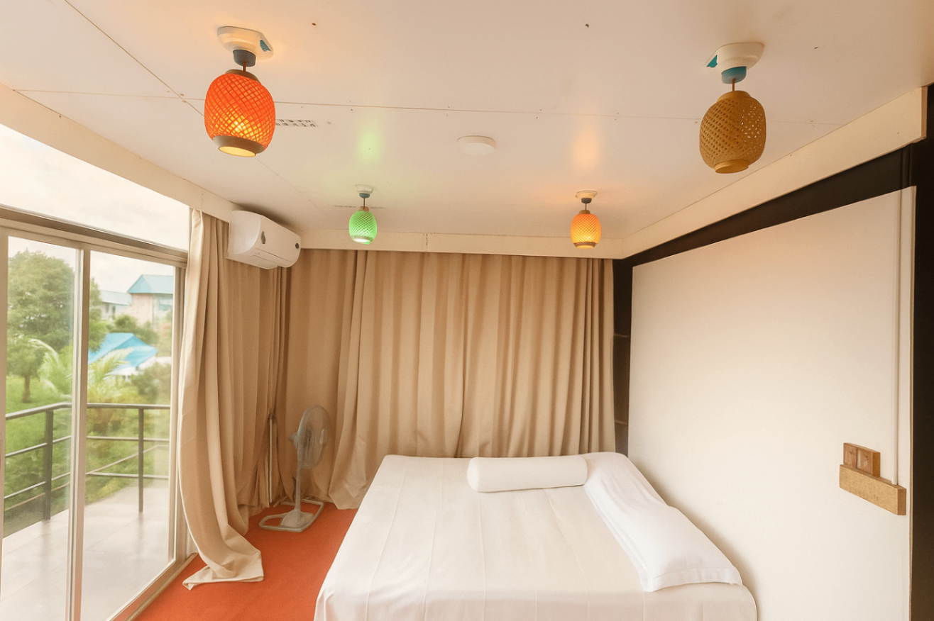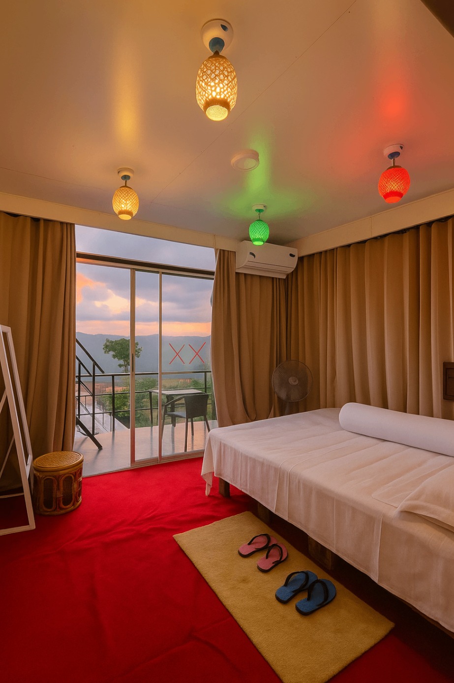 BELI cottage comprises 1 couple Bed, AC, 1 Bedside Table, 1 stand fan, 1 shaped balcony. The room is furnished with an t-table and 1 large mirror. Our modern-fittings spacious bathroom is equipped with standard toiletries as well as all the amenities. A Complimentary Bottle of water, and access to the largest garden area are provided during your stay. You will get a full infinity hill view of Mizoram from inside and outside the cottage.